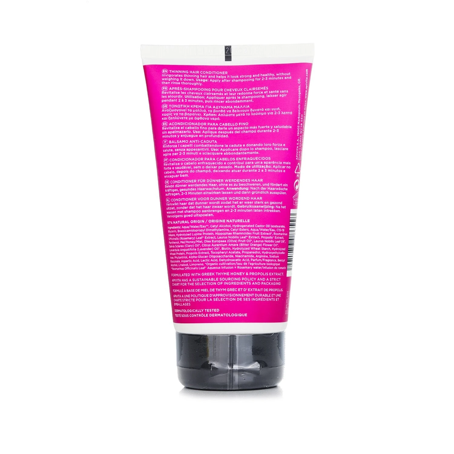 A strengthening, volumizing & anti-hair loss conditioner for thinning hair Offers prevention & treatment of seasonal or hereditary hair loss Developed with a rich formulation with 97% natural origin ingredients Contains APISHIELD HS to protect hair from external stressors (air pollution & styling), prevent breakage & split ends Blended with Hippophae TC & lupin proteins to strengthen hair Infused with laurel, thyme honey & Greek olive oil to hydrate & nourish hair Replaced water with a tonic & anti-ageing infusion of Greek organic rosemary Revitalizes hair & lifts the mood with a unique blend of laurel, rosemary, lavender, sage & neroli organic essential oils Detangles hair & offers volume without weighting it down Promotes healthy hair growth effectively Leaves hair smooth, shiny & strong Dermatologically tested & suitable for homeopathy