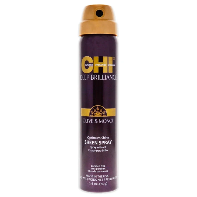 CHI Deep Brilliance Optimum Shine Sheen Spray includes a unique blend of Olive Oil and Monoi Oil. It replenishes vital oils, giving the hair a natural shine.